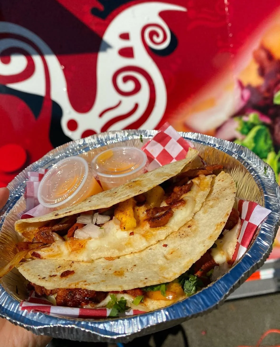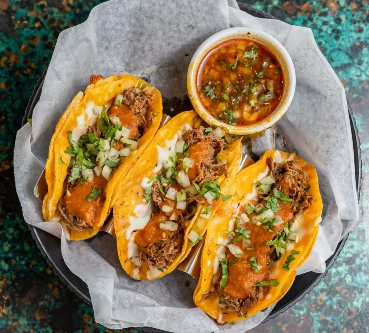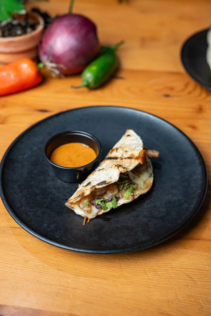 TACO GOBERNADOR - A COASTAL MASTERPIECE, A LUXURIOUS FUSION OF LAND AND SEA. PLUMP, JUICY SHRIMP ARE SAUTÉED WITH POBLANO PEPPER, ONIONS, AND A TOUCH OF GARLIC, THEN FOLDED INTO A GOLDEN, SLIGHTLY CRISPY TORTILLA LAYERED WITH MELTED CHEESE THAT PULLS WITH EVERY BITE. THE SHRIMP ARE KISSED WITH SMOKY CHIPOTLE OR A SPLASH OF LIME. FINISHED WITH FRESH CILANTRO AND A DRIZZLE OF CREAMY SALSA AND PICKLED ONIONS. (Closed On Monday)