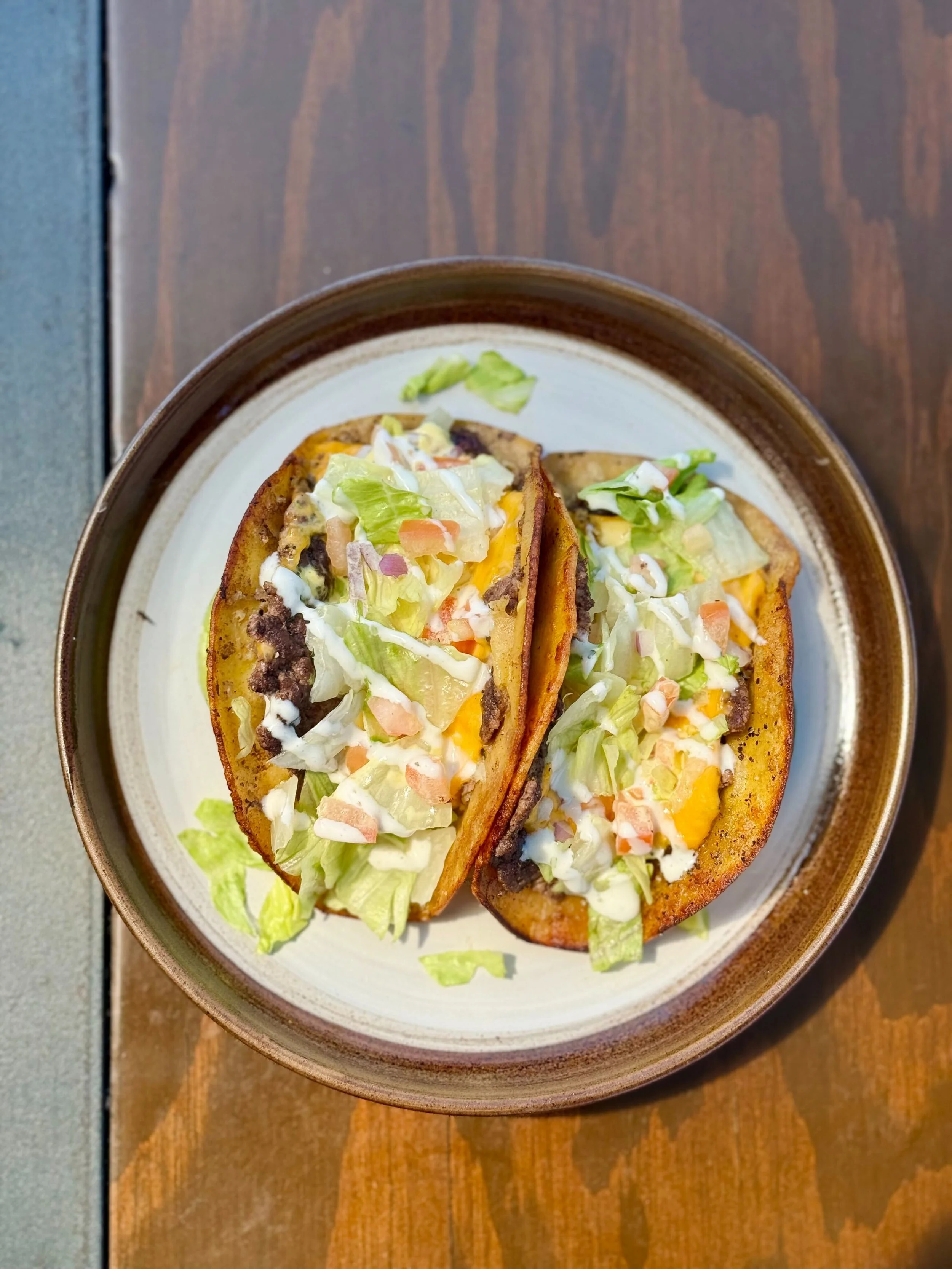 SMASH BURGER TACO | CRISPY SMASH BURGER BEEF PATTY, AMERICAN CHEESE, SPECIAL SAUCE, ONION, TOMATO, AND SHREDDED LETTUCE. SERVED WITH A SIDE OF RANCH.