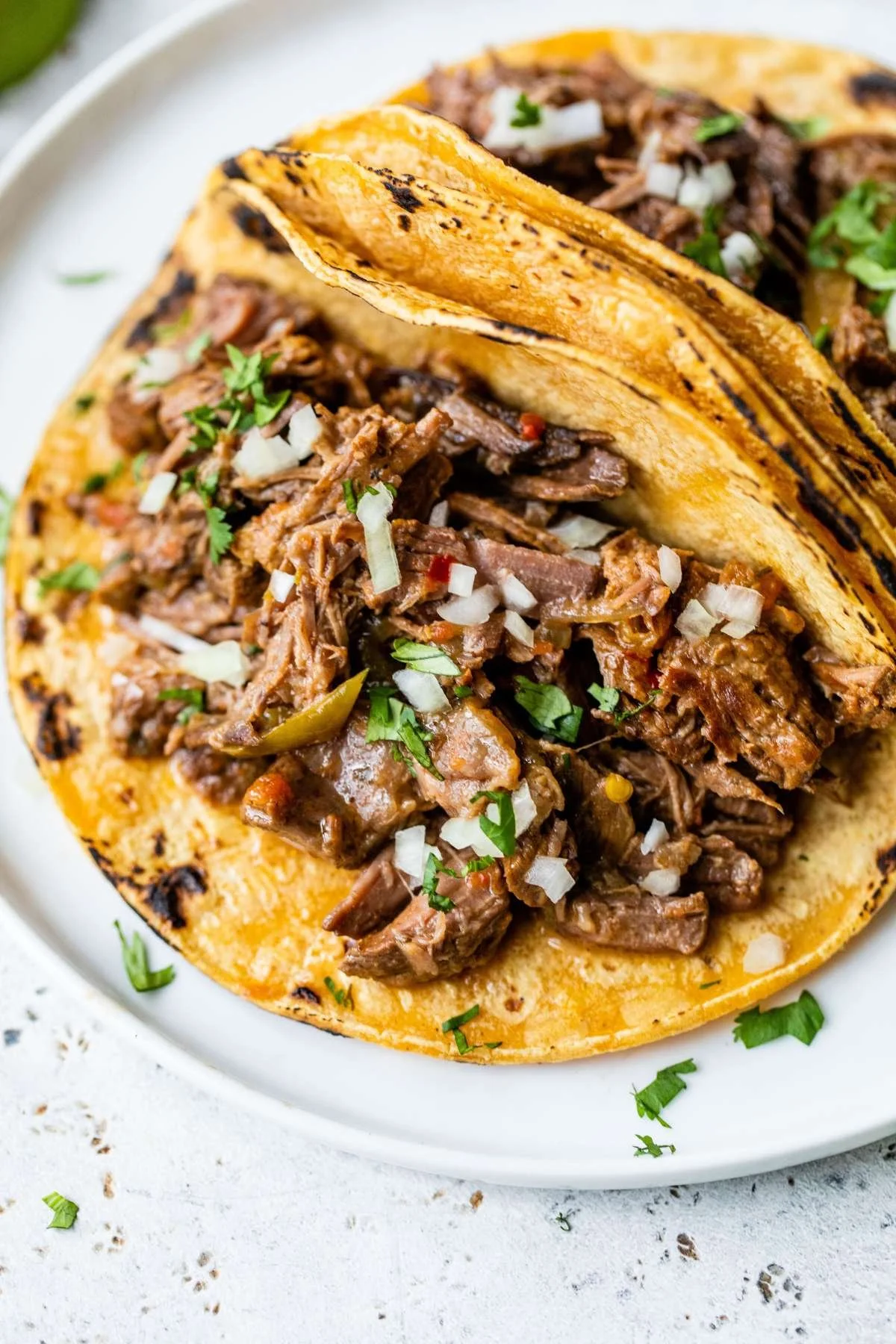 A BEEF BIRRIA TACOS WITH CONSOMMÉ.