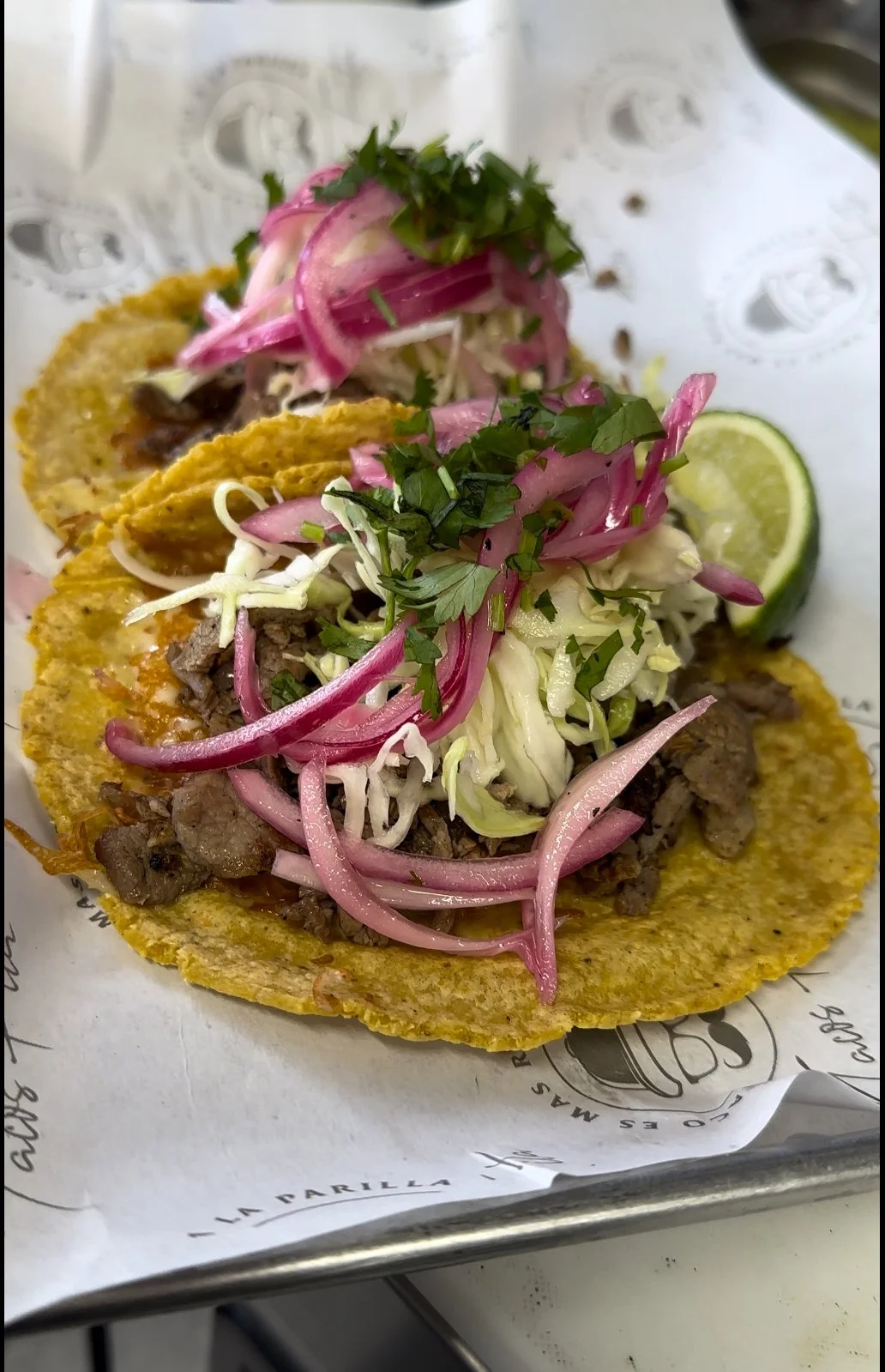 ASADA TACO: CHAR GRILLED ASADA MEAT GRILLED TONPERFECTIONS TOPPED OFF WITH SHREDDED CABBAGE ZESTY PICKLED ONION AND CILANTRO.