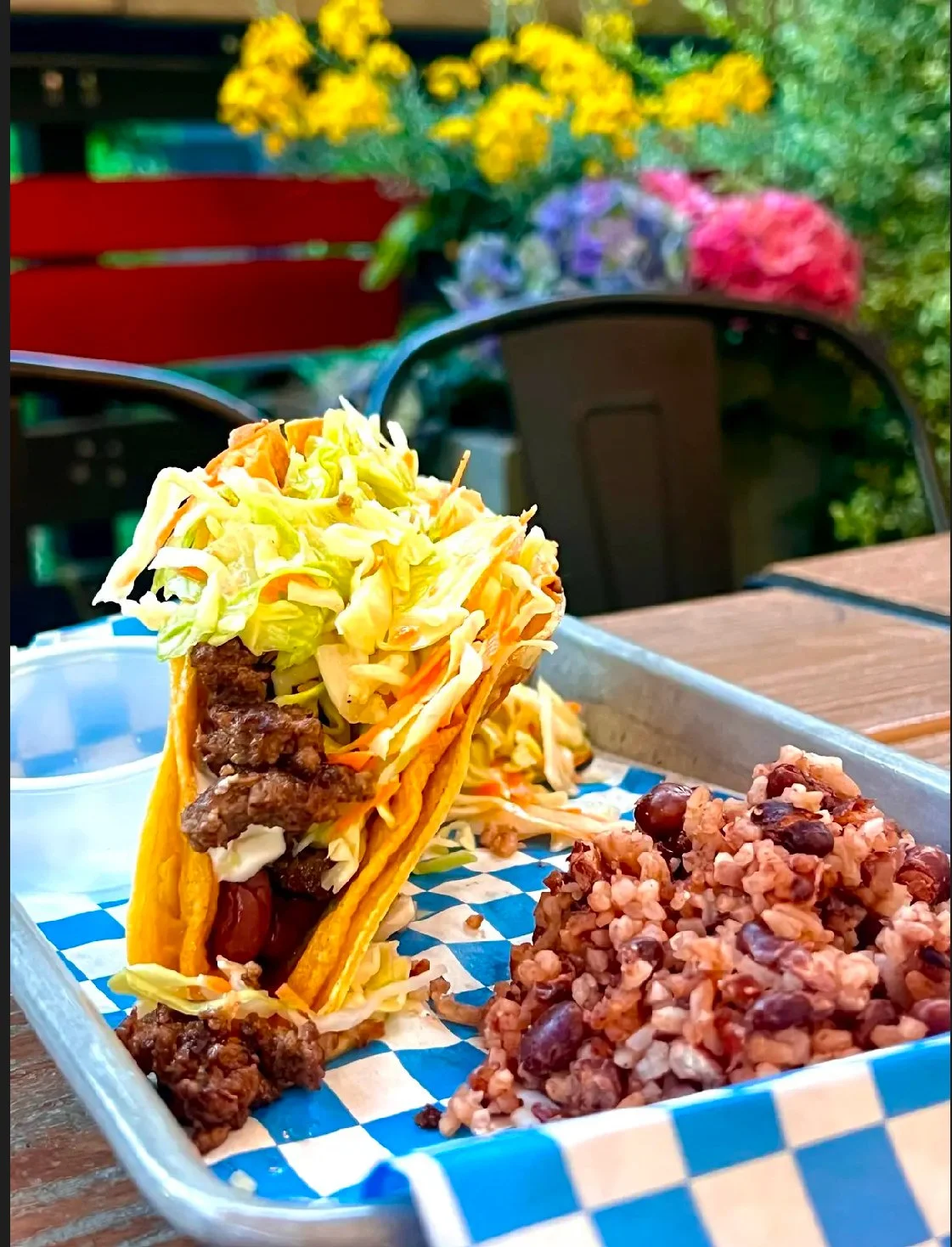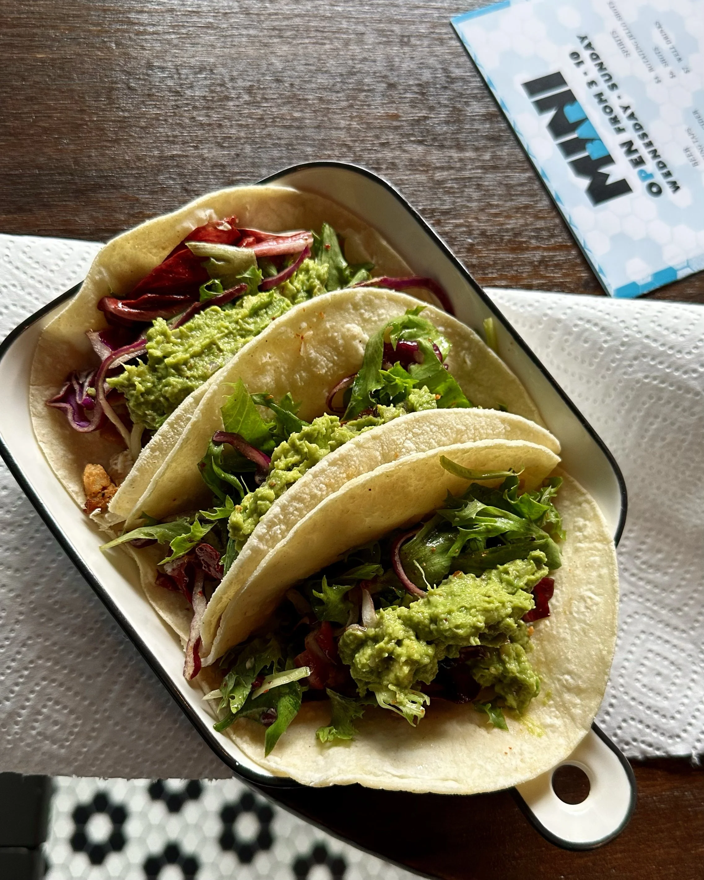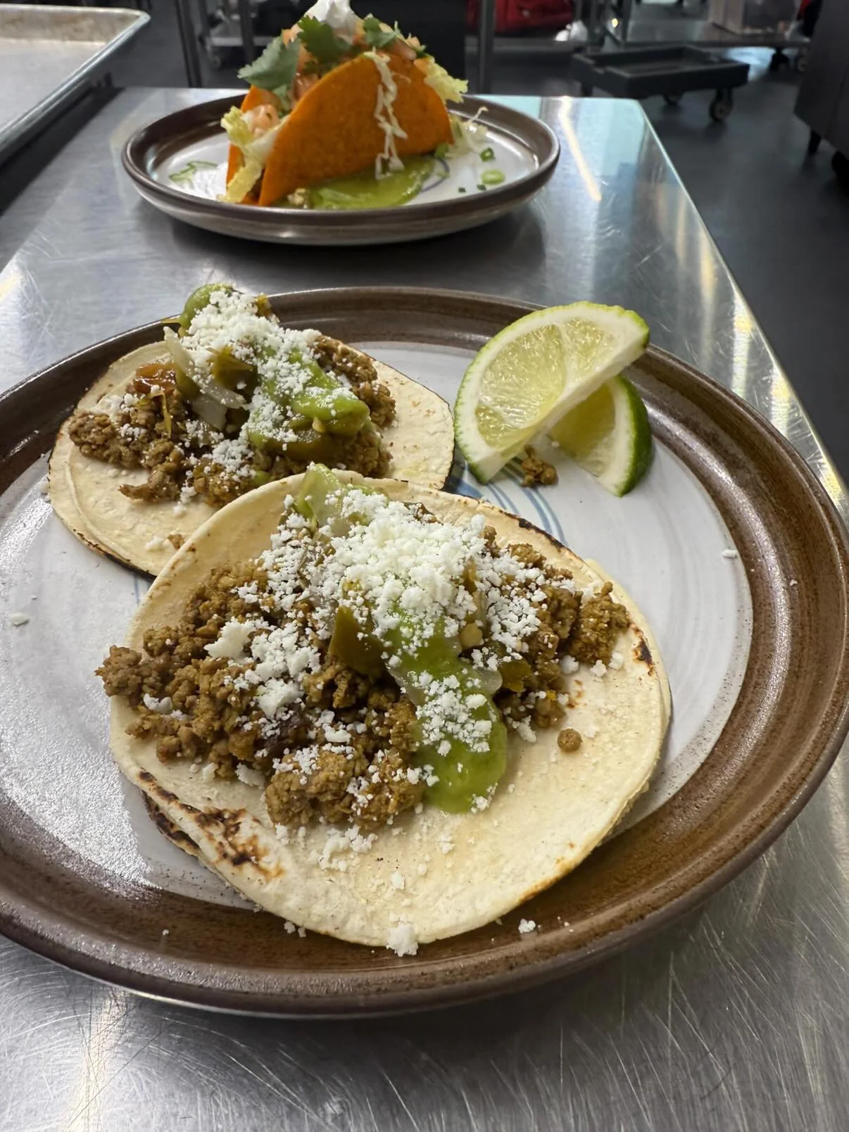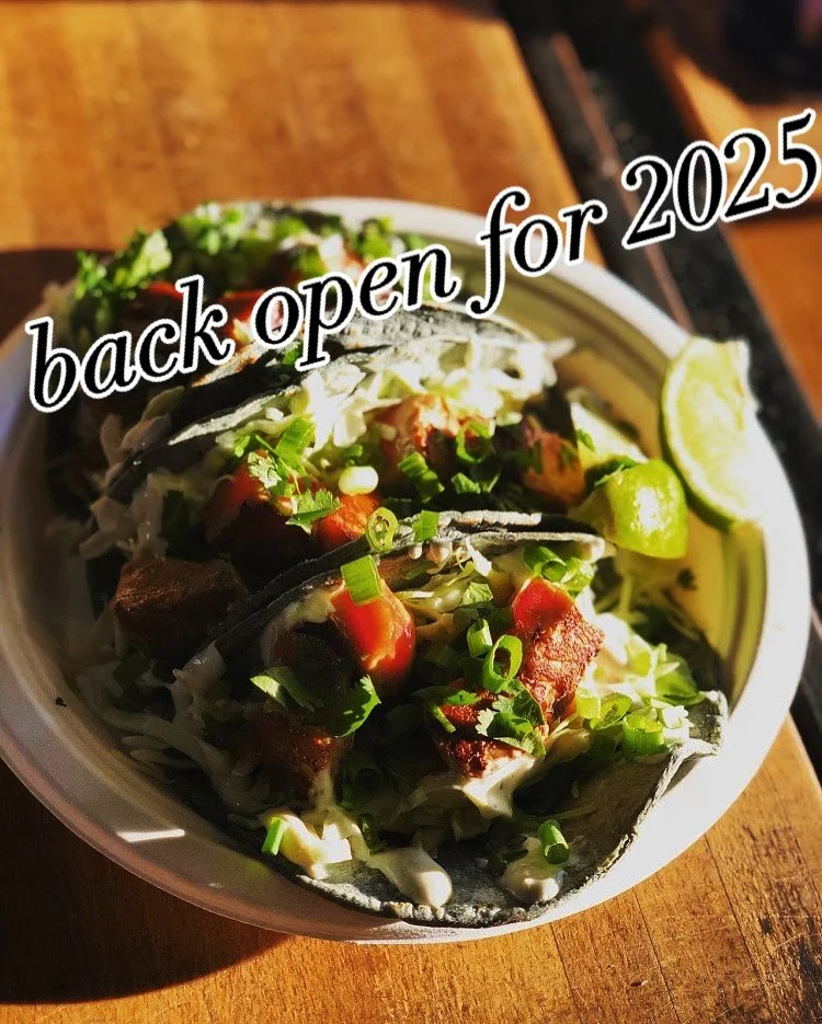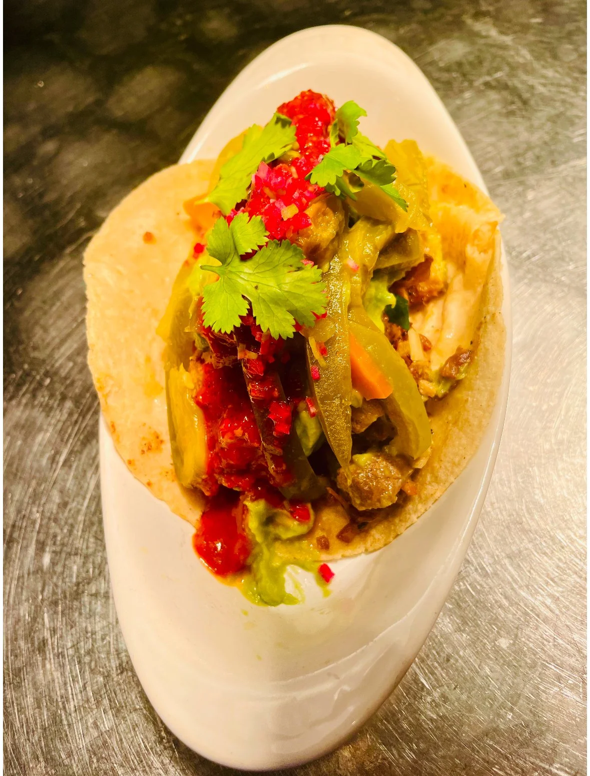 THERE ARE SEVERAL TACO OPTIONS: 1.) JACKFRUIT TACOS WITH PINEAPPLE SALSA. 2.) JACKFRUIT BIRRIA TACOS. 3.) MUSHROOM TACOS. 4.) BBQ JACKFRUIT TACOS. 5.) JACKFRUIT TACOS WITH ONIONS AND CILANTRO AND 6.) TOFU TACOS. (Closed on Monday & Tuesday.)