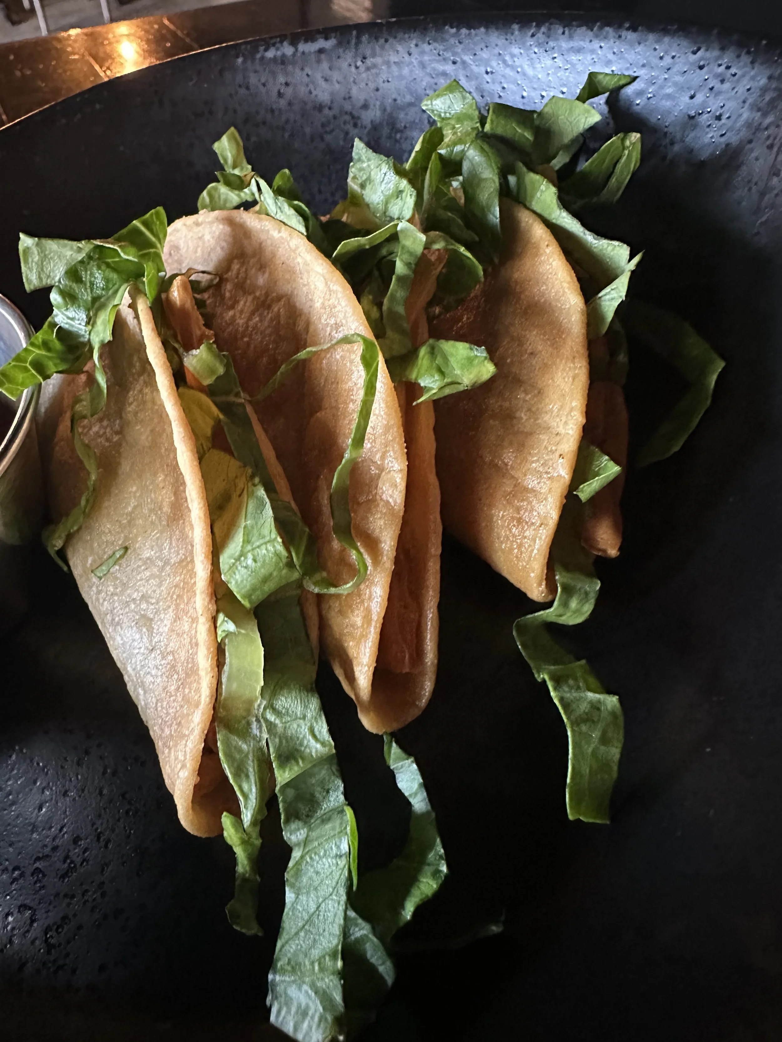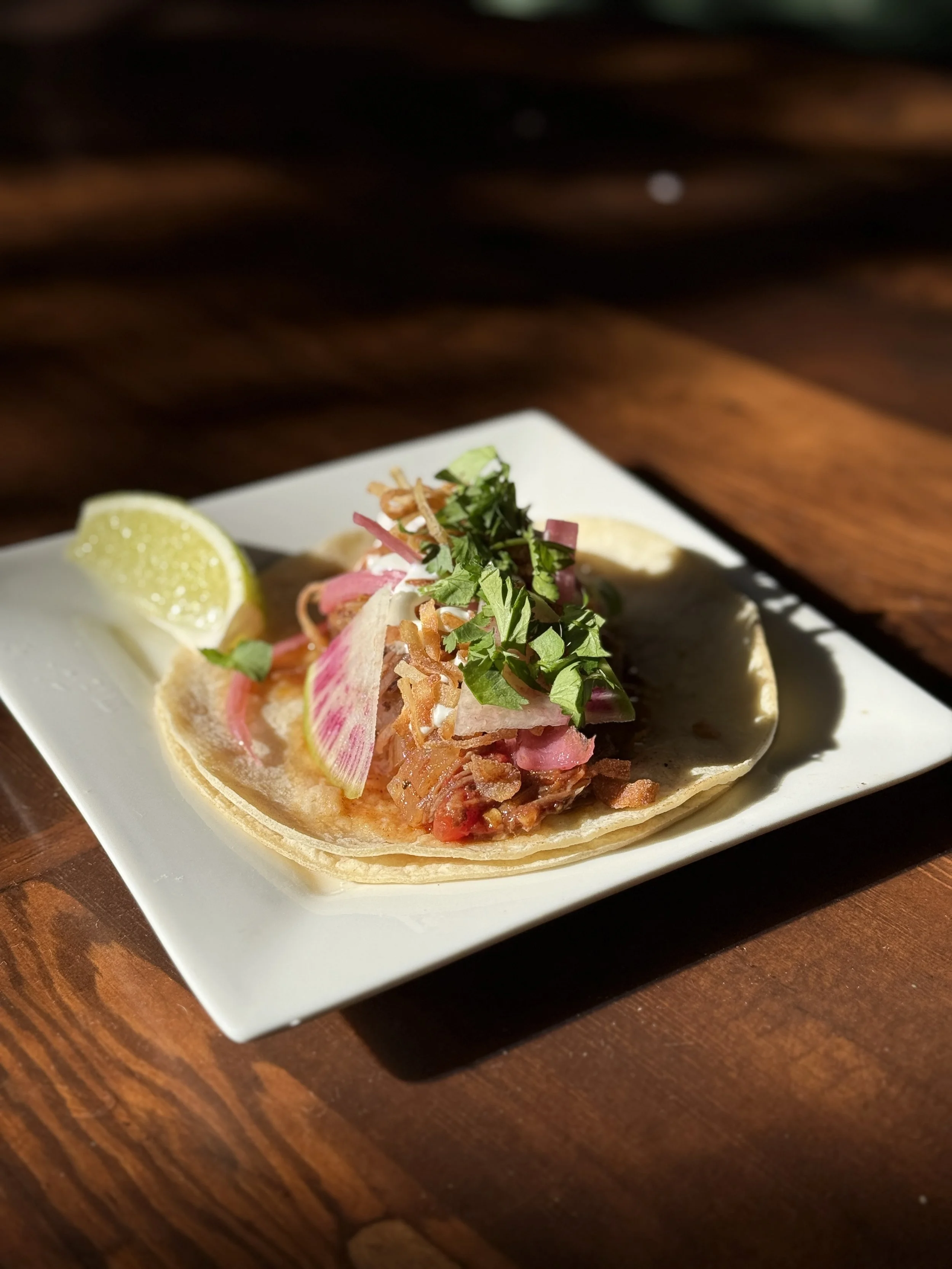 CORN TORTILLAS, ADOBO BRAISED SMOKED BRISKET, WATERMELON RADISH, FRIED SHALLOT, CREMA & CILANTRO.