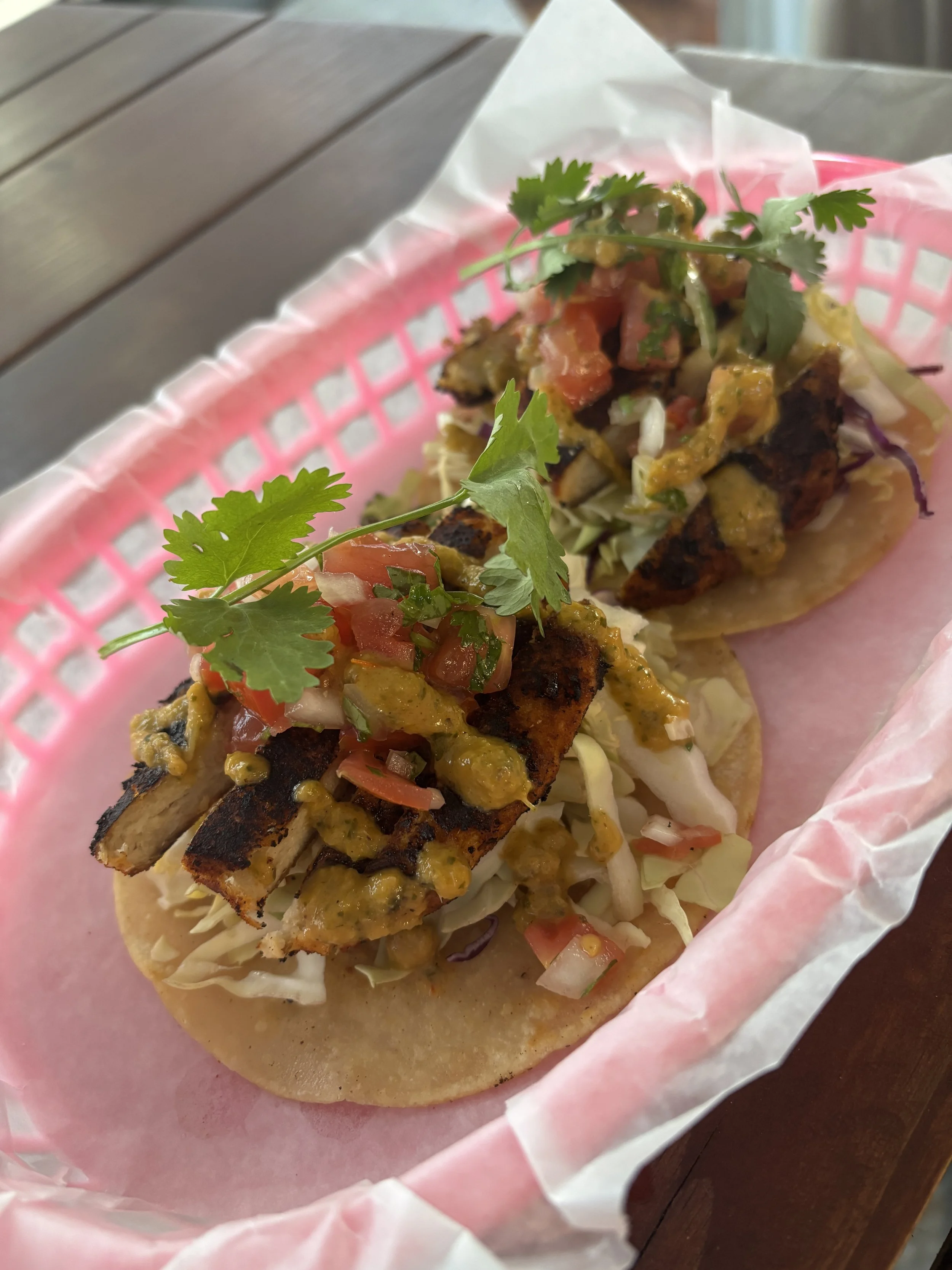 A BLACKENED CHICKEN TACO WITH MANGO HABANERO SALSA, SLAW, AND PICO DE GALLO ON A CORN TORTILLA. PLANT BASED”. (Closed Monday & Tuesday)