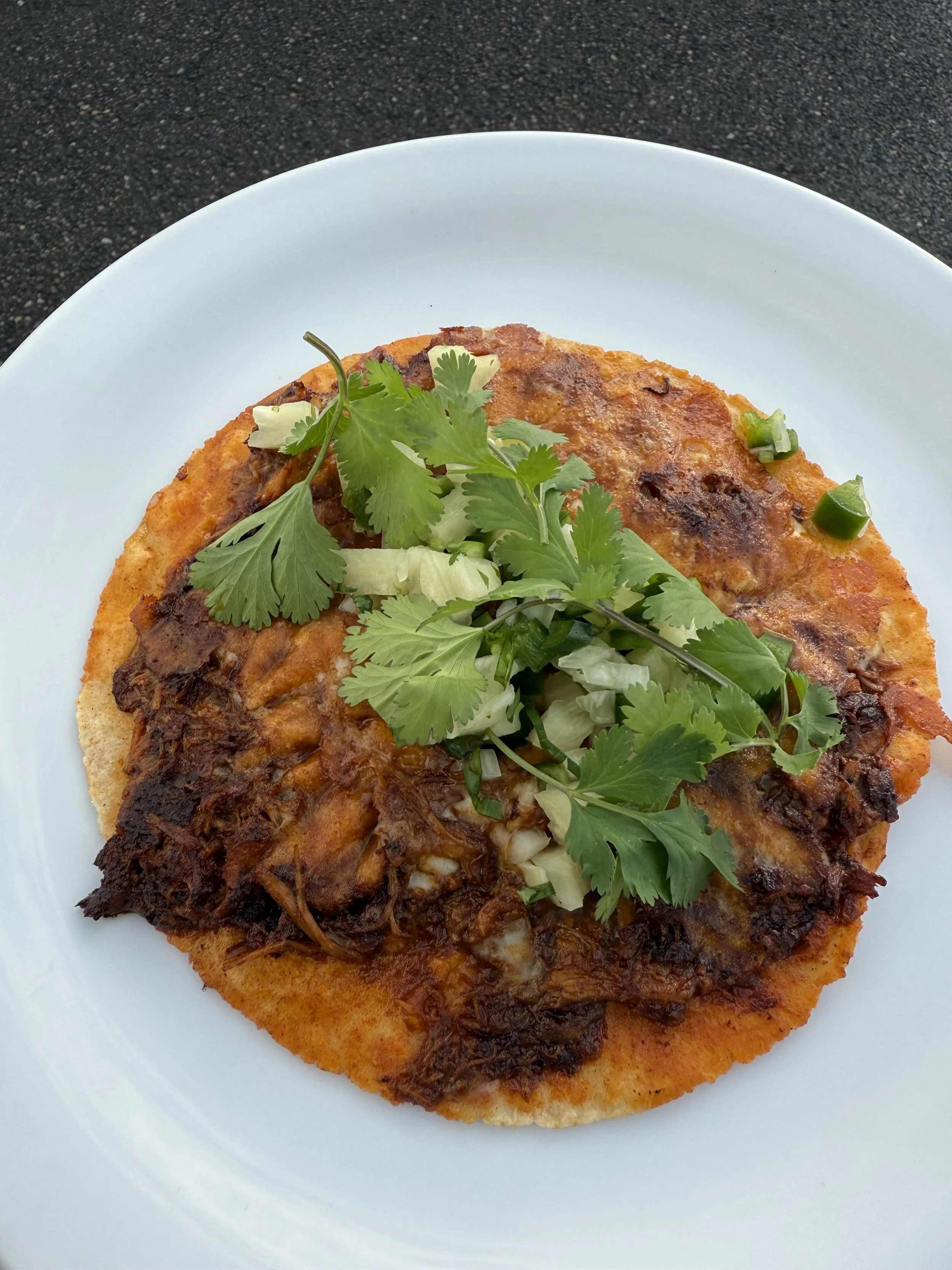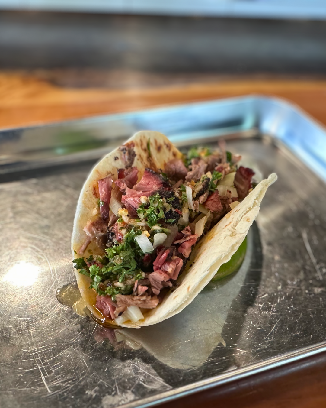 SLOW SMOKED CHOPPED BRISKET, WITH A CHIMICHURRI SAUCE, ON A ROASTED TORTILLA. (Closed Monday.)