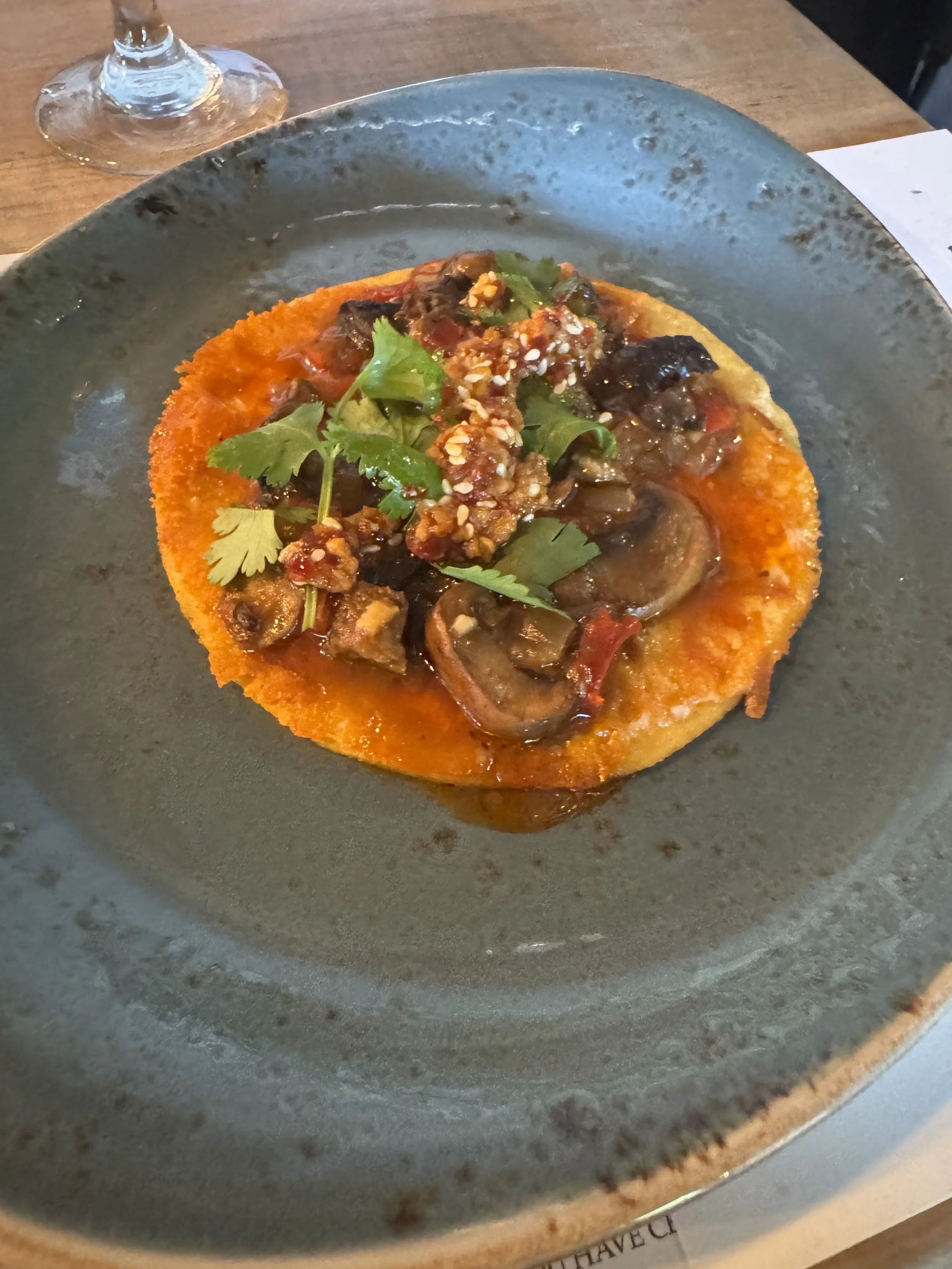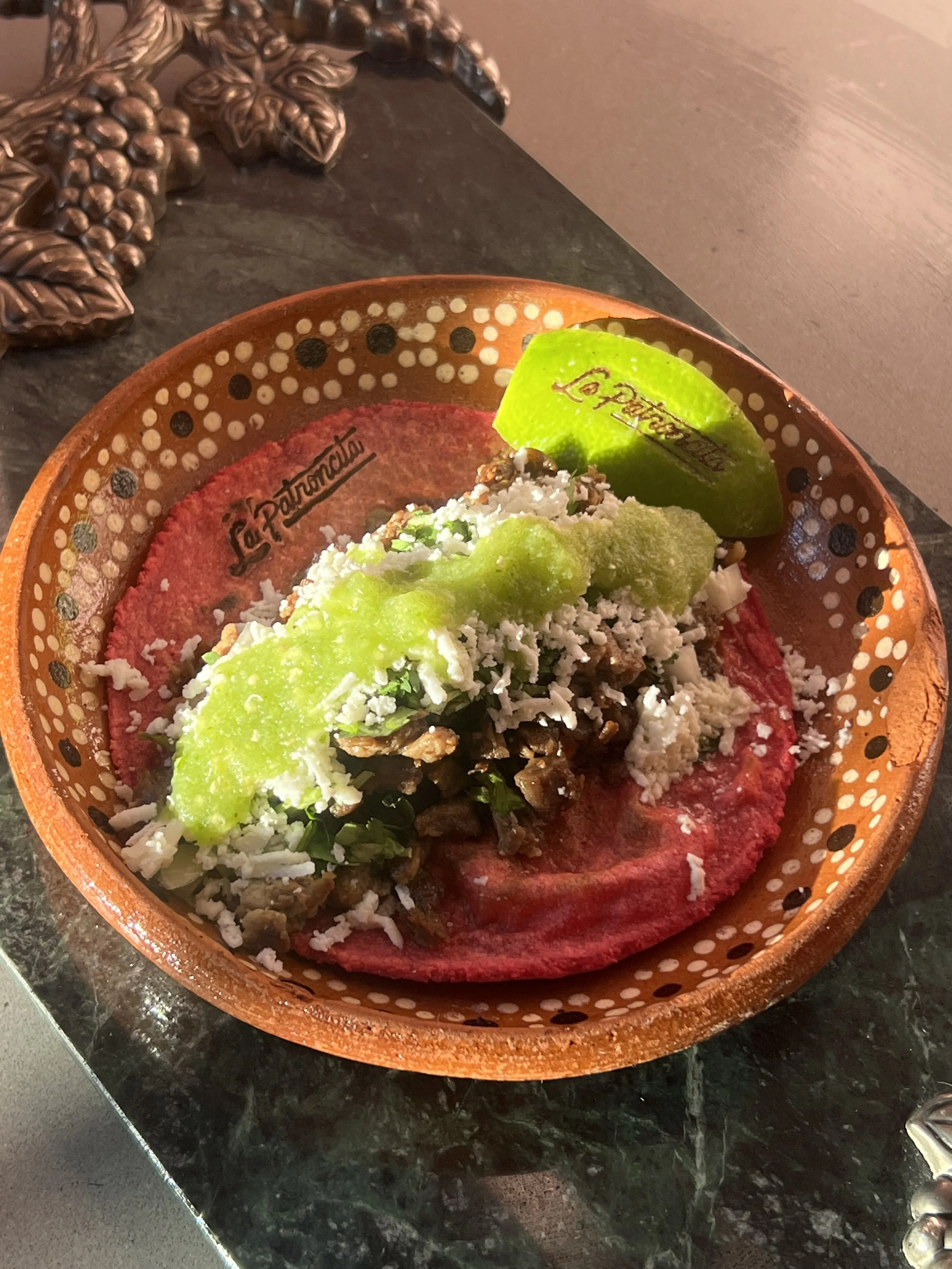 MUSHROOM ADOBO TACO - SOY AND VINEGAR BRAISED MUSHROOM GUISADO, ONION, CILANTRO, SALSA MATCHA FILIPINA.
