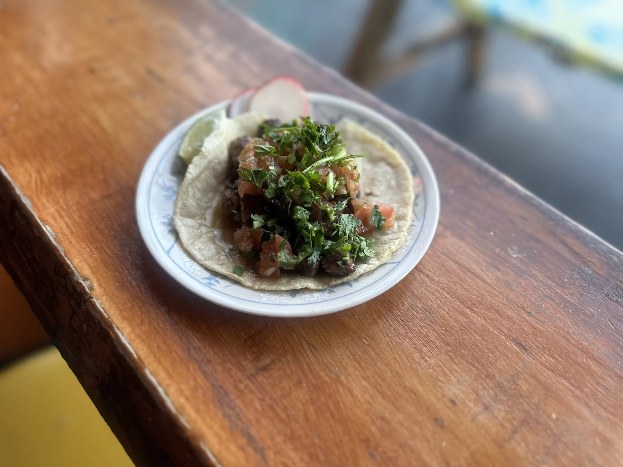 LAOS PETITE TENDER BARBACOA TACO WITH PENDLETON BEEF PETITE TENDER, ONION, CILANTRO, CORN TORTILLA, LAOS SALSA. (Closed on Monday.)