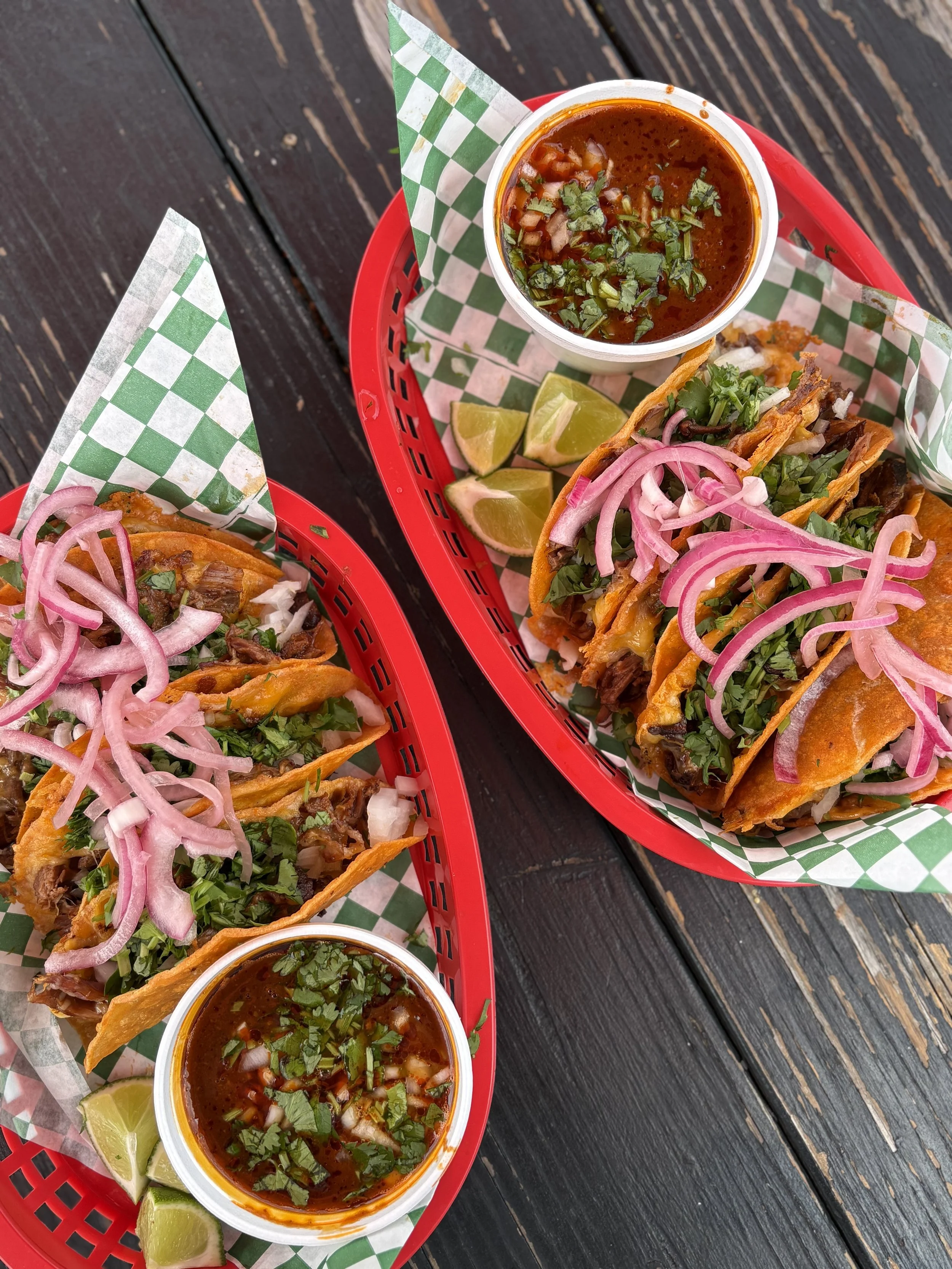 2 TACOS FOR $5. TWO OF OUR LEGENDARY TACOS DE BIRRIA (OUR BIRRIA RECIPE HAS BEEN HANDED DOWN FOR 3 GENERATIONS. SLOW COOKED BEEF FOR 4 HOURS IN SEASONINGS, CHILI PEPPERS AND BROTH.