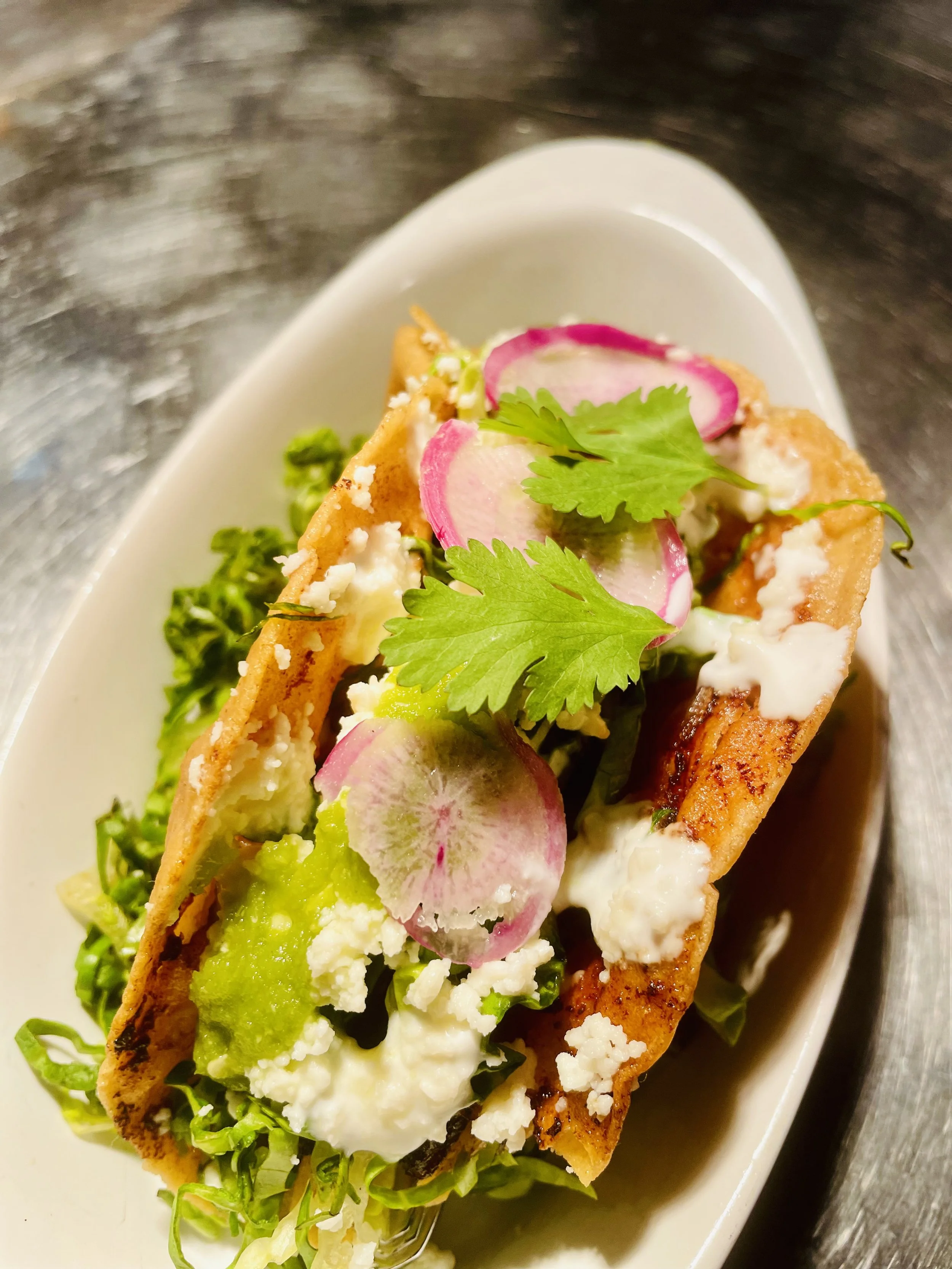 A TINGATE UN TACO (CHICKEN TINGA, CRISP ROMAINE, CREMA, SALSA VERDE, QUESO FRESCO) ON A CRISPY TORTILLA.