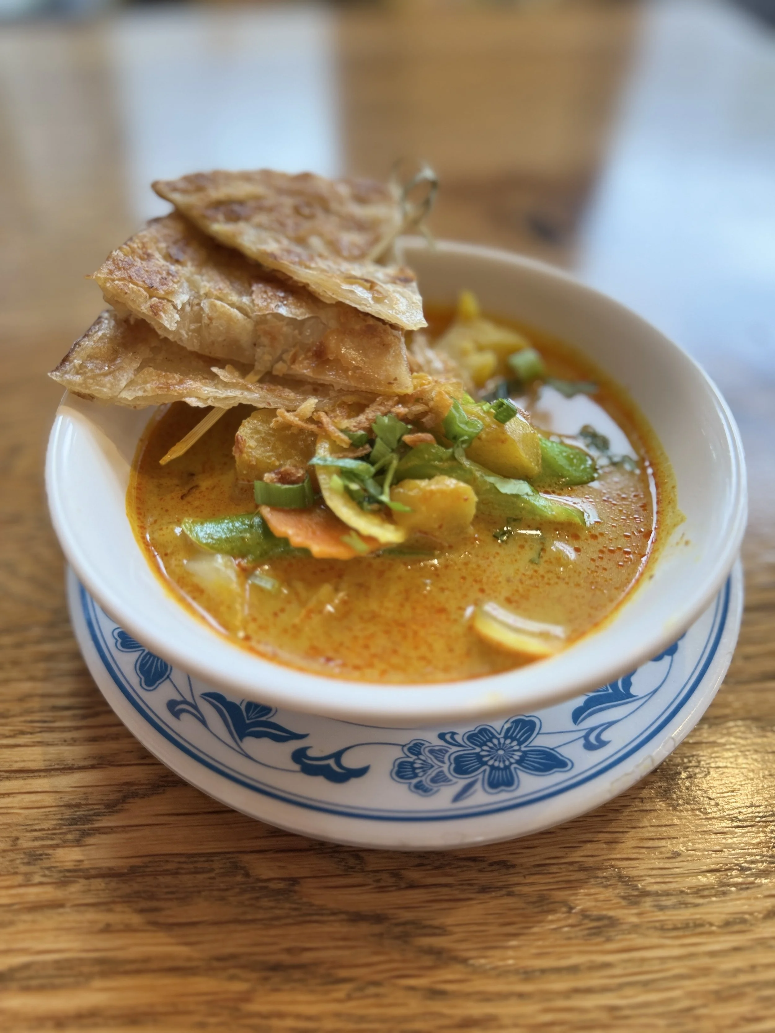 KENG KARI + ROTI $10, POTATO, CARROT, ONION, AND MEDLEY VEGETABLE, SERVED WITH CRISPY ROTI BREAD.