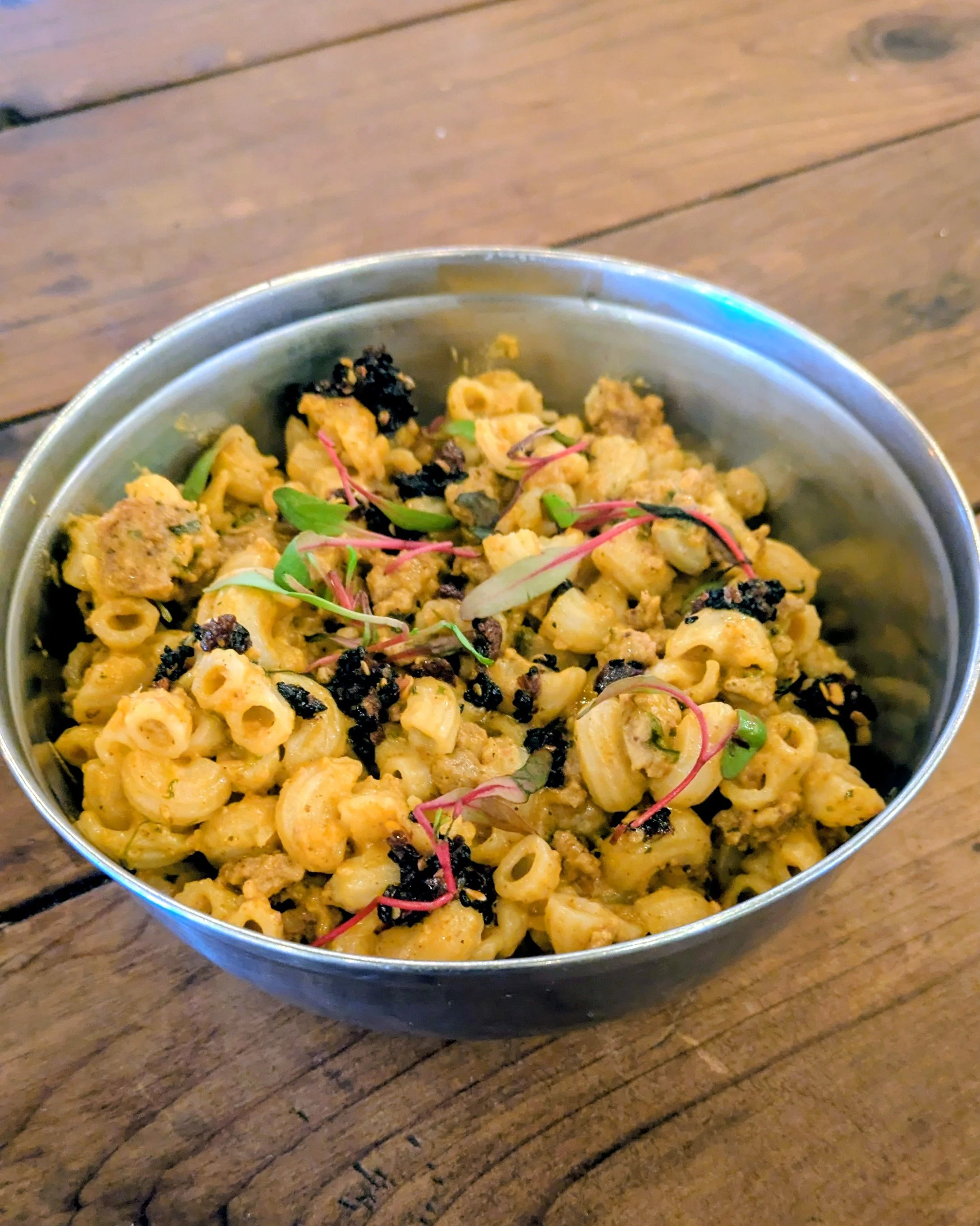 CHARRED KING OYSTER AND OYSTER MUSHROOMS SERVED OVER GINGER JASMINE RICE WITH A CREAMY GOLDEN CURRY GRAVY AND MAPLE-CINNAMON GLAZED GRILLED CARROTS. WARM, COMFORTING, AND DEEPLY SAVORY — A PLANT-BASED TAKE ON CURRY, INSPIRED BY THE FOREST. (Closed Monday.) -