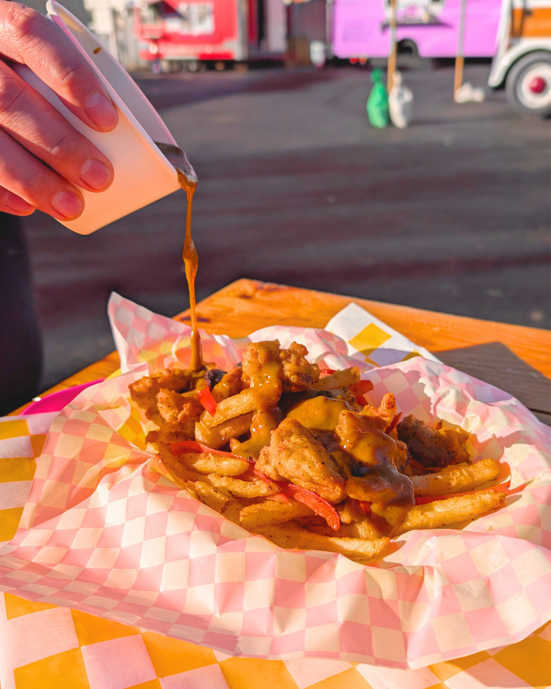 ADOBO SA GATA SPICE BAG: FRIES, CHICKY BITES, ONIONS, AND BELL PEPPERS TOSSED IN SPICES AND SERVED WITH A SIDE OF ADOBO COCONUT CURRY SAUCE.