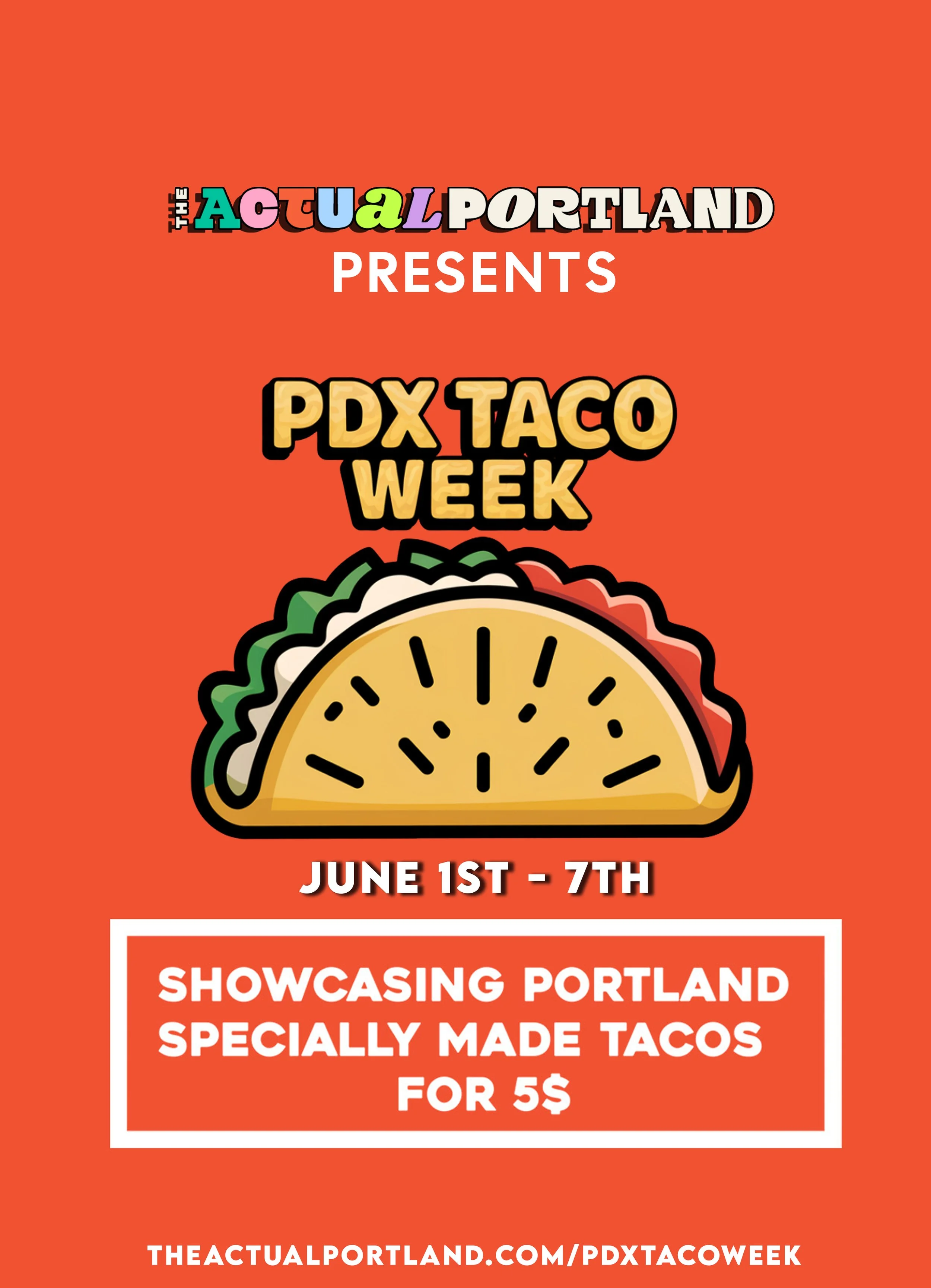 PDX Taco Week is a vibrant celebration of Portland's underrepresented & diverse taco scene, featuring special deals and unique creations from local taquerias, restaurants & more. During this week-long event, participating eateries offer inventive taco specials, allowing food enthusiasts to explore a variety of flavors and culinary styles across the city. It's an opportunity for both locals and visitors to indulge in Portland's rich taco offerings, often at discounted prices, while supporting local businesses. Whether you're a fan of traditional recipes or adventurous new twists, PDX Taco Week promises a flavorful experience for all taco lovers, from June 1st - 7th . and the official list of locations are now posted soon. And if you are a business that would like to be apart of this event then please email us at theactualpdx@gmail.com.